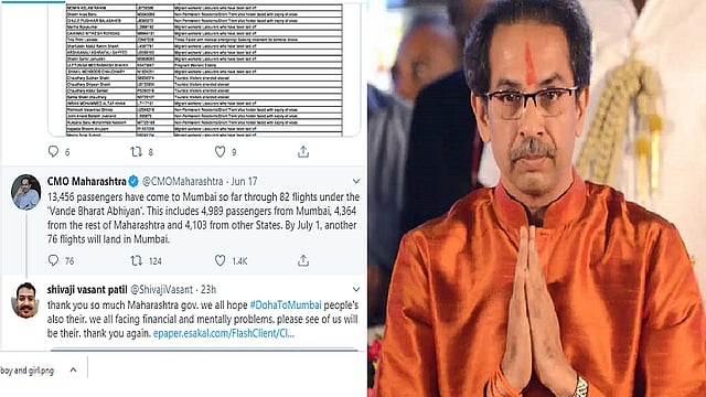 आखाती देशातील कतारमध्ये नाशिकचे शिवाजी पाटील यांच्यासह सुमारे 180 महाराष्ट्रातील नागरिक अडकले आहेत. परदेशामध्ये अडकलेल्या भारतीयांना परत भारतामध्ये आणण्यासाठी केंद्र सरकारने "वंदे भारत' अभियान सुरू केले आहे. त्यासंदर्भात मुख्यमंत्री ठाकरे यांनी ट्विटरद्वारे बुधवारी (ता. 17) सकाळी ट्विट केले. येत्या 1 जुलैपर्यंत आणखी 76 विमाने मुंबईच्या विमानतळावर उतरणार आहेत. त्यामुळे अजूनही परदेशात अडकलेल्यांना भारतात परत आणले जाणार असल्याचे मुख्यमंत्र्यांनी आपल्या ट्विटमध्ये म्हटले आहे. शिवाजी पाटील यांनी मुख्यमंत्र्यांच्या ट्विटला रिट्विट करीत कतारमध्ये अडकून असलेल्यांसाठी दोहा ते मुंबई विमानाची सोय करण्याची मागणी करीत मुख्यमंत्र्यांनी दिलेल्या प्रतिसादाबद्दल आभारही मानले आहेत.
