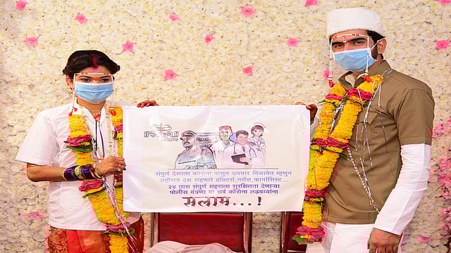 दरम्यान, विवाह सोहळ्याआधी साखरपुडा संपन्न झाला. वधू हर्षदा ही औषधनिर्माण शाखेतील उच्चशिक्षित आहे. कोरोना विरुद्धच्या लढ्यात अनेक डॉक्टर, नर्सेस, आरोग्य, स्वच्छता कर्मचारी आणि पोलिस बांधवांना संसर्ग झाला असून काहींना त्यात जीवही गमवावा लागला आहे. साखरपुड्यावेळी हर्षदाने ऍप्रॉन तर वर राहुलने खाकी रंगाचा शर्ट आणि मास्क परिधान करून त्यांना अनोख्या पद्धतीने श्रद्धांजली अर्पण केली. या विवाह सोहळ्यासाठी पाटील आणि सूर्यवंशी परिवाराने आहेर स्वरुपात रक्कम न स्वीकारता ‘आपण घरीच राहा, सुरक्षित रहा’ हाच आमचा आहेर आहे, असा संदेशही दिला. या आगळ्यावेगळ्या विवाहाची सर्वत्र जोरदार चर्चा सुरू आहे.