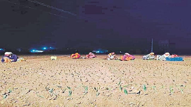 रात्री अंधारात बल्बच्या उजेडात कांदा लागवड
