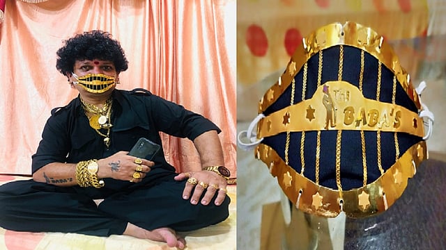 हल्ली महिला वर्गाला साडीच्या कलर्सनुसार मास्क ही मॅचिगं वापण्याची फॅशन सुरू झाली आहे. त्यामुळे विविध आकाराचे व कलर मध्ये मास्क बाजारात उपलब्ध झाले आहेत. असो... सातपूर चा गोल्डन मॅन म्हणून परिचीत असलेले मकरंद साळी यांना अंगावर विविध प्रकारचे सोन्याचे दागीने घालायला खुपच आवडते. त्यानी आतापर्यंत किमान साडेतीन किलोचे गळ्यातील साखळ्यां, कडे, अंगठ्या आदी वस्तू रोज ते वापरतात. कोरोनाच्या काळातही त्यांनी सातपूर मधीलच दंडगव्हाळ सुवर्ण पिढीतून तब्बल दोन लाख दहा हजार रूपयाचा मास्क तयार केला आहे. या गोल्डन मास्कमुळे पुन्हा एकदा सातपूरच्या बाबा टेलर्सची चर्चा सुरू झाली आहे. हा मास्क गोविंद दंडगव्हाळ,सातपूर ता सुवर्णपेढीने ( पावणेचार तोळे ) सोने वापरुन तयार केला. सातपूर परिसरात हा चर्चेचा विषय ठरला आहे.
