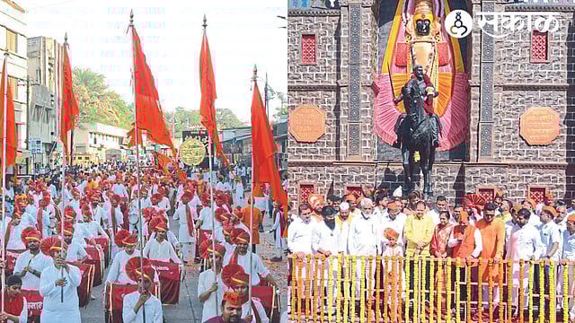 Nashik Shiv Jayanti 2024 : शहरातील मुख्य शिवजयंती मिरवणुकीला सोमवारी (ता.१९) सायंकाळी साडेपाच वाजता प्रारंभ झाला. पालकमंत्री दादा भुसे यांनी नारळ वाढविल्यावर कार्यकर्त्यांच्या आग्रहास्तव काही काळ ढोलच्या तालावर ठेकाही धरला. मिरवणुकीच्या अग्रभागी असलेल्या शिवनाद वाद्य पथकाने मिरवणुकीची शोभा वाढविली. (Nashik Shiv Jayanti 2024 marathi news)