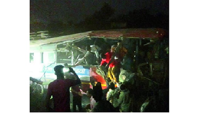 गुरुवारी (ता. 27) सायंकाळी मनमाड आगाराची बस (एमएच 12, ईएफ 6965) श्रीरामपूरकडे जात होती. येवल्याच्या पाठीमागे हॉटेल अपेक्सजवळ बसचालक कंटेनरला ओव्हरटेक करीत असताना, पुढे चालत असलेल्या ट्रॅक्टरवर धडकला. या धडकेत रस्त्याच्या कडेला खड्ड्यात जाऊन बस पडली. अपघातात बसचा एका बाजूचा पत्रा पूर्णतः कापला गेला. अपघात होताच प्रवाशांनी बसमधून उतरून स्वत:चा जीव वाचविला. बसचालक राजू हटकर (वय 58) यांना पोटाला जबर मार लागला असून, वाहक परबत तायडे (वय 37) यांनाही कंबरेजवळ मार लागला. त्या दोघांनाही नाशिकला हलविले आहे.