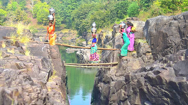 नाशिक : खरशेत (ता. त्र्यंबकेश्वर) ग्रामपंचायतीच्या परिसरात बारा पाडे असून, गावातील अनेक कुटुंब शेतीसाठी पाड्यापासून दीड किलोमीटरवरील तास नदीच्या काठी वास्तव्यास आहेत. पंचवीस वस्त्यांमधील आदिवासींची (Tribals) संख्या तीनशेहून अधिक असून इथल्या महिलांना रोजच्या पिण्याच्या पाण्यासाठी नदीवर टाकण्यात आलेल्या बल्ल्यांवरून चालत जाण्याची, डोंबारींपेक्षाही भयानक कसरत दररोज करावी लागते.