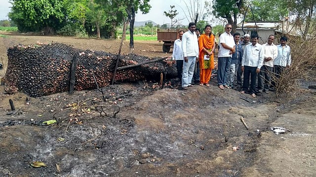 ठेंगोडा (नाशिक) : येथील सुतगिरणी रस्त्यालगत असलेल्या शेतातील कांदाचाळीस काल शनिवार (ता.१६) रोजी रात्रीच्या सुमारास अचानक आग लागुन साठवलेला कांदा जळून भस्मसात झाल्याने शेतकऱ्याचे तीन लाख रूपयांचे नुकसान झाले आहे. शासनाकडुन त्वरित नुकसान भरपाई मिळावी अशी मागणी शेतकऱ्यांनी केली आहे.