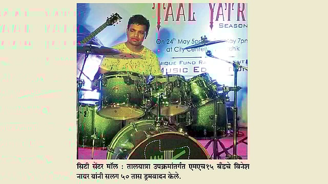 नाशिक - सलग ५० तासांहून अधिक वेळ ड्रमवर विविध गाणी वाजविताना विनेश नायरने संगीतप्रेमींची मने जिंकली. सिटी सेंटर मॉल येथे एमएच १५ द बँड यांच्यातर्फे आयोजित तालयात्राच्या तिसऱ्या हंगामात विनेशने ही कामगिरी केली. उपस्थितांनीही सुरेल गाणी सादर करताना त्याला प्रोत्साहन दिले.