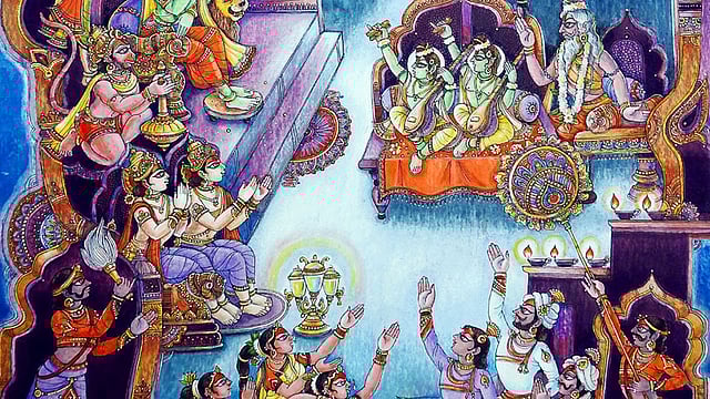 अश्वमेध यज्ञासाठी संपूर्ण अयोध्यानगरी नटली आहे. माणसांचा जनसागर लोटला आहे. तेवढ्यात प्रभू श्रीरामांच्या कानावर सुस्वर येऊन पडतात, तोच हे स्वर कोठून व कोणाचे, हे राजमहालाच्या सज्जातून प्रभू श्रीराम पाहतात. तामस वेश धारण केलेले दोन बटू आणि मुनी दृष्टीस पडतात. त्यांना प्रभू श्रीराम आदरपूर्वक राज महालात बोलवतात. राजमंडपात येताच ते दोन बटू प्रभू श्रीरामांना अभिवादन करतात. ते म्हणतात, ''आम्ही महर्षी वाल्मीकींचे शिष्य आहोत. त्यांनी शिकवलेल्या श्रीराम चरित्राचे गायन करतो.'' तोपर्यंत श्रीरामांना माहीत नव्हते, की आपल्यासमोरील हे चिमुकले म्हणजे आपलेच पुत्र कुश-लव आहेत.