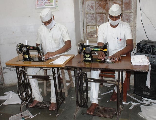 अकोला : कोरोना विषाणू संसर्ग प्रतिबंधासाठी सर्वत्र विविध उपाययोजना होत असतांना तुरुंगांमध्ये बंदीवासात असणाऱ्या बंदीजनांचे ही या विषाणू संसर्गापासून रक्षण व्हावे यासाठी तुरुंग प्रशासन विविध उपाययोजना करुन काळजी वाहतांना दिसत आहे. कैदी, कर्मचाऱ्यांच्या वैयक्तिक तसेच एकूणच तुरुंग आवारातील सार्वजनिक स्वच्छतेवर भर देण्यात येत आहे. या शिवाय येथील कैद्यांकडून कापडी मास्क शिवून घेण्याचे कामही कारागृहात सुरू आहे. जिल्हाधिकारी कार्यालयातील कर्मचारी व पोलिस दलातील कर्मचाऱ्यांनाही हे मास्क देण्यात येतील असे यावेळी सांगण्यात आले.
