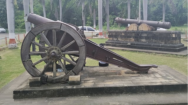 दोन बाजूस असलेल्या दोन तोफा ब्रिटिश पद्धतीच्या असून त्यांच्यावर क्रमांक कोरण्यात आलेले आहेत. या तोफादेखील खोदकामात सापडलेल्या तोफांप्रमाणे ब्रिटिश राणीचा मुकुट व लोगो व चौदाव्या शतकात जगप्रसिद्ध झालेल्या सर गवाईन या लेखकाने रचलेल्या कवितेची ओळ कोरण्यात आली आहे. विशेष म्हणजे "जो वाईट विचार करेल त्यालाच लाज वाटेल' असा त्या कवितेतील ओळीचा अर्थ आहे.