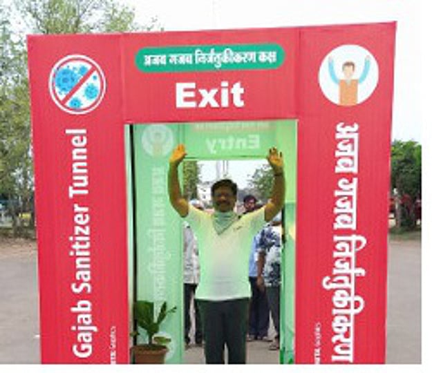 गडचिरोली : सध्या कोरोना विषाणूचे जगभरात थैमान सुरू असून त्यासाठी निर्जंतुकीकरणाला विशेष महत्त्व प्राप्त झाले आहे. मात्र, गडचिरोलीत सामूहिक निर्जंतुकीकरण कक्षाची सोय नव्हती. ही समस्या लक्षात घेत येथील नगर परिषदेचे मुख्याधिकारी संजीव ओहोळ यांच्या संकल्पनेतून सतीश त्रिनगरीवार यांच्या अजब-गजब विचार मंच या संस्थेने अनोखे निर्जंतुकीकरण कक्ष तयार केले आहे. विश्वरत्न डॉ. बाबासाहेब आंबेडकरांच्या जयंतीदिनी या कक्षाची यशस्वी चाचणी घेऊन हा उपक्रम प्रारंभ करण्यात आला आहे.