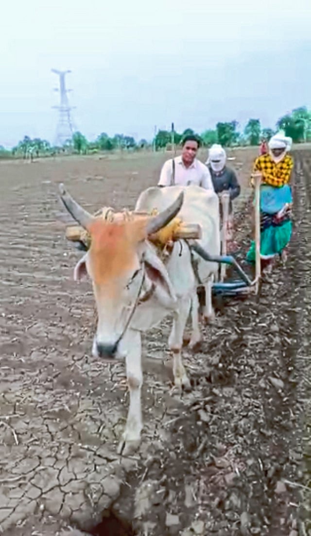 एकाच बैलाच्या साहायाने केली शेतीची कामे