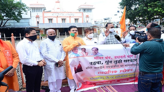 नागपूर ः राज्य सरकारने मदिरालये उघडली; मात्र मंदिरे उघडण्यास काय अडचण आहे, असा सवाल करून भाजपच्या वतीने मंगळवारी वर्धा रोडवरील साई मंदिरासमोर महासचिव चंद्रशेखर बावनकुळे आणि शहराध्यक्ष आमदार प्रवीण दटके यांच्या नेतृत्वात आंदोलन करण्यात आले. नवरात्रोत्सवापूर्वी देवालये उघडण्यात आली नाही तर तीव्र आंदोलन झेडण्यात येईल, असा इशराही यावेळी देण्यात आला.