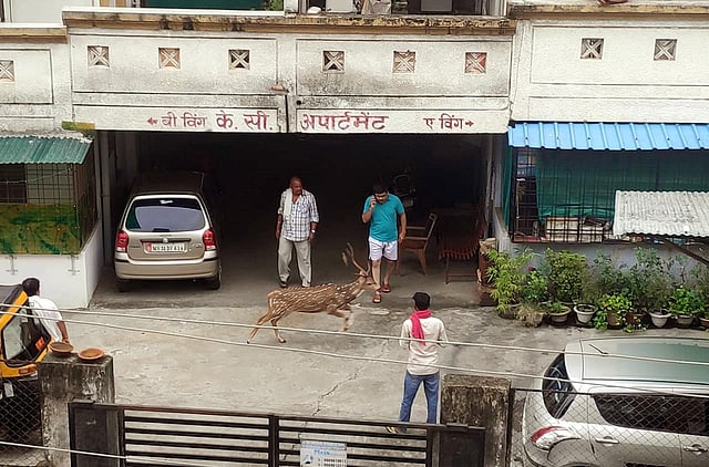 नागपूर : लॉकडाउनमध्ये नागरिक घरात आणि वन्यप्राणी शहरात दिसत होते. आता अनलॉकच्या काळात मानवाची शहरातील वर्दळ वाढली असतानाही वन्यप्राणी गावात येऊ लागले असल्याचा अनुभव आज काटोल रोडवरील केसी अपार्टमेंटमध्ये आला. अंगावर ठिपके असलेले चितळ अचानक परिसरात शिरल्याने रहिवाशांना आश्चर्य वाटले.