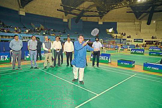 नागपूर : विभागीय क्रीडा संकुलात सुरू झालेल्या राज्य बॅडमिंटन स्पर्धेच्या उद्घाटनप्रसंगी सर्व्हिस करताना केंद्रीय मंत्री नितीन गडकरी. सोबत अरुण लखानी, मंगेश काशिकर व इतर शहरात जवळपास २५० मैदाने विकसित करण्याचा संकल्प आपण केला आहे. यापैकी एका मैदानावर महाराष्ट्र बॅडमिंटन संघटनेने (MAHARASHTRA BADMINTON ASSOCIATION) आंतरराष्ट्रीय दर्जाची अकादमी उभारावी. त्यास सर्वतोपरी सहकार्य करू, असे आश्वासन केंद्रीयमंत्री नितीन गडकरी यांनी दिले.