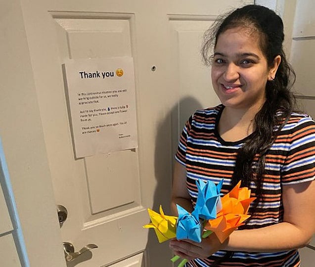 तिने आपल्या घराच्या प्रवेशद्वारावर 'थँक यू' अशी पाटी व 'ट्युलिप'ची कागदी फुले ठेवली असून, घरी येणारा प्रत्येक व्यक्ती ती भेट आनंदाने स्वीकारून तिच्याबद्दल आदर व्यक्त करतो आहे. तिच्या या उपक्रमाची सर्वत्र चर्चा व कौतुक होत आहे. श्वेता पुष्कर कुळकर्णी तिचे नाव. अमेरिकेत सर्वकाही सुरळीत सुरू असताना अचानक कोरोनाचा उद्रेक झाला. पाहतापाहता या आजाराने हजारो अमेरिकावासींचे बळी घेतले. या आणीबाणीच्या परिस्थितीत तेथील नागरिकांना घरात लॉकडाउन व्हावे लागले. त्यामुळे श्वेताच्या पतीसह बहुतांश अमेरिकन कर्मचारी सध्या 'वर्क फ्रॉम होम' करीत आहेत. या कठीणप्रसंगी अनेक जण अत्यावश्यक सेवा पुरवून देशवासींची मदत करीत आहेत. जीव धोक्यात घालून सेवा देणाऱ्या या कोरोना योदध्यांसाठी काहीतरी करावे, असा विचार श्वेताच्या मनात आला. तिने चार ओळींची 'थँक यू' अशा आशयाची नोट दारावर चिकटवली. शिवाय अमेरिकेत सर्वांना आवडणारे व केवळ उन्हाळ्यातच (वसंत ऋतूत) फुलणारी दहा ते बारा 'ट्युलिप'ची फुले लावली. श्वेताने विविध रंगांची ही कागदी फुले स्वतःच्या हाताने तयार केली हे उल्लेखनीय.