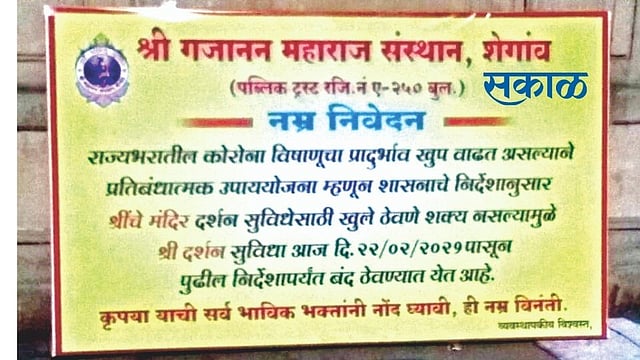कोरोनाचा प्रादुर्भाव मोठ्या प्रमाणात वाढत असल्याने शेगाव येथील संत गजानन महाराजांचे मंदिर रविवारी, २१ फेब्रुवारीच्या रात्रीपासून पुढील आदेशापर्यंत भाविकांना दर्शनासाठी पुन्हा बंद करण्यात आले आहे. मागील वर्षी कोरोनामुळे १७ मार्च रोजी श्रीं चे मंदिर बंद करण्यात आले होते. कोरोनाचा प्रभाव कमी झाल्यानंतर परत १७ नोव्हेंबर २०२० पासून शासनाच्या मार्गदर्शक सूचनांनुसार व ई पासद्वारे मंदिर भाविकांसाठी खुले करण्यात आले होते.