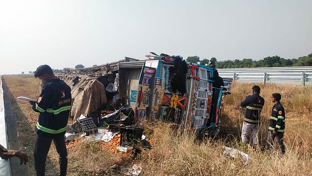 संमृध्दी महामार्गावर नाशिकवरून कोलकत्यासाठी टोमॅटो घेऊन जात असलेला ट्रक रस्ता दुभाजकाला धडकून पलटी झाला. त्यामध्ये ट्रकचालक हलील खान (वय 22) क्लीनर खालील उद्दीन (वय 18) जखमी झाले.