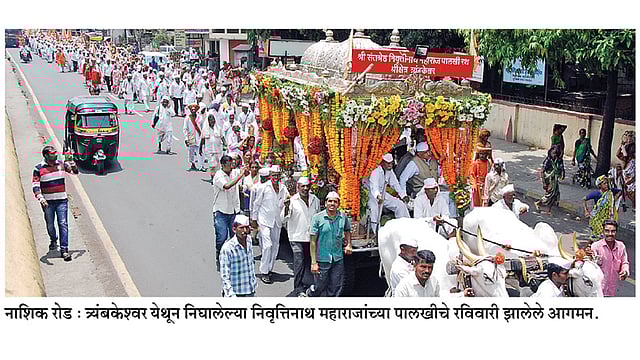 तत्पूर्वी वारकऱ्यांच्या प्रचंड उत्साहात व जल्लोषात काल (ता. १०) संत निवृत्तिनाथ महाराजांची पालखीचे नाशिकमध्ये आमगन झाले. जुन्या नाशिकमधील काजीपुऱ्यातील संत नामदेव विठ्ठल मंदिरात पालखीचा मुक्काम होता. नंतर दिंडी जुन्या नाशिकमधील नामदेव विठ्ठल मंदिरात पोचली. आज काकडा आरतीनंतर हरिपाठाचे वाचन झाले. नंतर वारकऱ्यांना सोमवार पेठेतील अहिर सुवर्णकार मंगल कार्यालयात भोजन देण्यात आले. सकाळी साडेदहाला पालखीचे पळसे गावाकडे प्रयाण झाले. निवृत्तिनाथ महाराज पालखीचे नाशिक रोडला दुपारी एकच्या सुमारास आगमन झाले. हातात भगवे ध्वज, डोक्यावर तुळशीची रोपे व जलकलश घेतलेल्या महिला व पुरुष संत निवृत्तिनाथाचे नामस्मरण, अभंग म्हणत सहभागी झाले. मुक्तिधाममध्ये पालखी येताच चौहान कुटुंबाने चांदीच्या रथात असेलला श्रींचा मुखवटा व पादुका डोक्यावर घेऊन मंदिरात प्रवेश केला. तेथे जगदीश चौहान, आदित्य चौहान व खासदार हेमंत गोडसे यांच्या हस्ते आरती झाली. संस्थानचे अध्यक्ष संजय महाराज धोंगडे, माजी अध्यक्ष त्र्यंबकराव गायकवाड, पुंडलिक थेटे, पद्माकर पाटील, राजाभाऊ कुलकर्णी आदी उपस्थित होते.