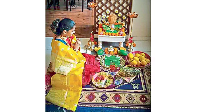 मागच्या वर्षीपासून आमची कन्याही पूजा करू लागली. एक वर्ष भातुकलीमध्ये केले होते सर्व! मागच्या वर्षीपासून रागरंगच वेगळा. मोठी पूजा आणि छोटी पूजा तिनेच केली. छान अंघोळ करून भल्या पहाटे लेकरू तय्यार! स्वयंपाकात जमेल ती सगळी मदत. मग पूजेची तयारी. छान टोपलीत आंबे मांडले. भाजी आणि फळे कोरून ठेवली आम्ही. साग्रसंगीत पूजा, पुन्हा सगळा नैवेद्य वाढायला मदत.