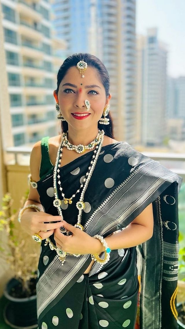 सोनालीने काळी पैठणी नेसली असून तिने घातलेले हलव्याचे दागिनेही उठून दिसत आहेत. मंगळसूत्र, कानातले. गळ्यातला हार, कानातले, बाजूबंद, अंगठी, बांगड्या, बिंदी असे हलव्याचे दागिने घातल्याने तिच्या सौंदर्याला चार चांद लागले आहेत.