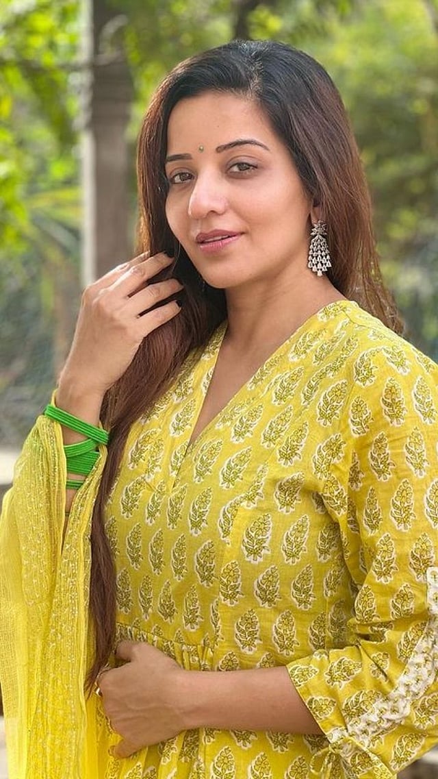 लेटेस्ट फोटोंमध्ये मोनालिसा पिवळ्या रंगाच्या सूटमध्ये खूपच सुंदर दिसत आहे. पिवळ्या रंगाच्या प्रिंटेड सूटवर हिरव्या बांगड्या, बिंदी आणि कानातली रिंग तिच्या सौंदर्यात भर घालताना दिसत आहे.