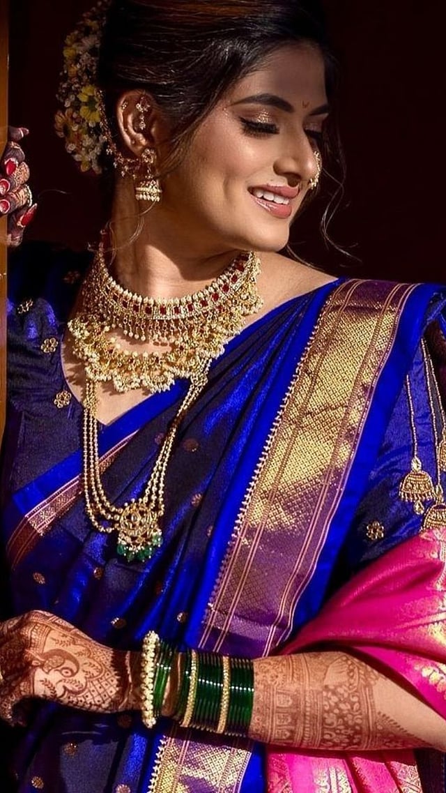 जड सोन्याच्या ऐवजी आता मिनिमल ज्वेलरीचा ट्रेंड आहे. पोल्की, ऑक्सिडाइज्ड सिल्वर किंवा पर्ल सेट तुमच्या लुकला एलिगंट आणि फ्रेश टच देतात.