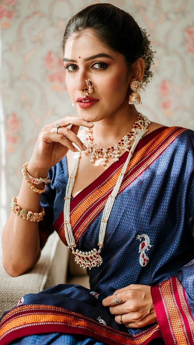 नुकतेच मीराने निळ्या खणाच्या साडीतले फोटो शेयर केले आहेत.