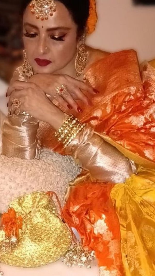 केशरी रंगाच्या बनारसी साडीत रेखा खूपचं सुंदर दिसत होत्या