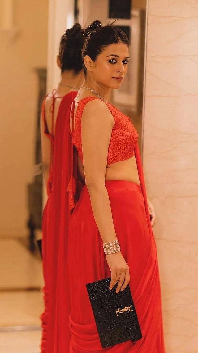 फोटोंमध्ये श्रद्धाने लाल रंगाची स्टायलिश साडी परिधान केलेली दिसत आहे, ज्यामध्ये ती खूप हॉट आणि बोल्ड दिसत आहे.