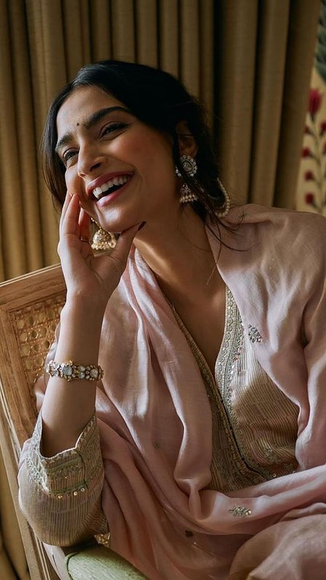 या फोटोत सोनमने ब्लश पिंक कलरचा सुंदर डिझायनर सूट परिधान केला असून त्यावर साजेशी ज्वेलरी घालून तिने तिचा लूक पूर्ण केला आहे.