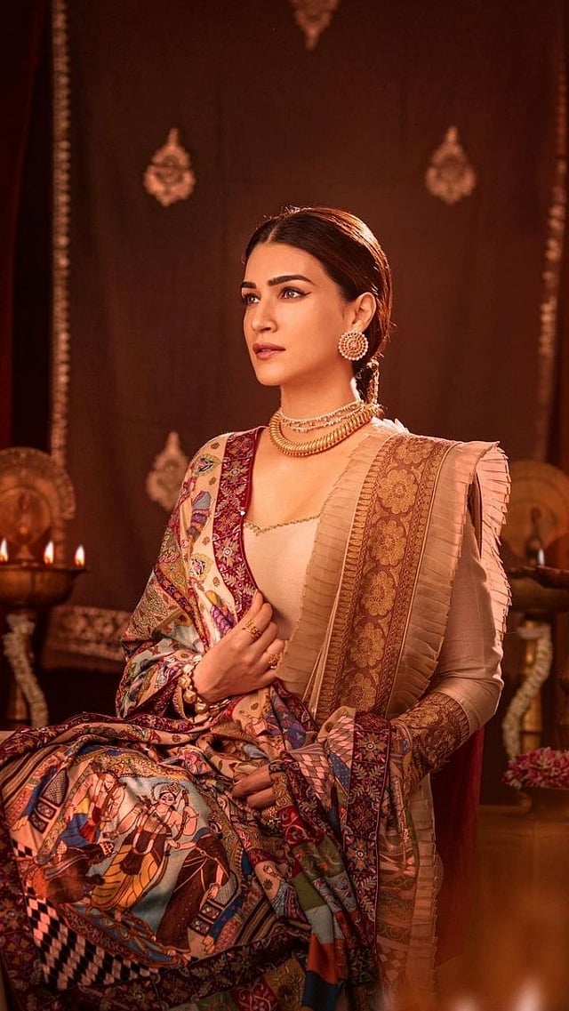 सिंपल लूकमध्ये 'राम दरबार'ने सजलेला क्रितीचा दुपट्टा सर्वांचे मन मोहून टाकत आहे.