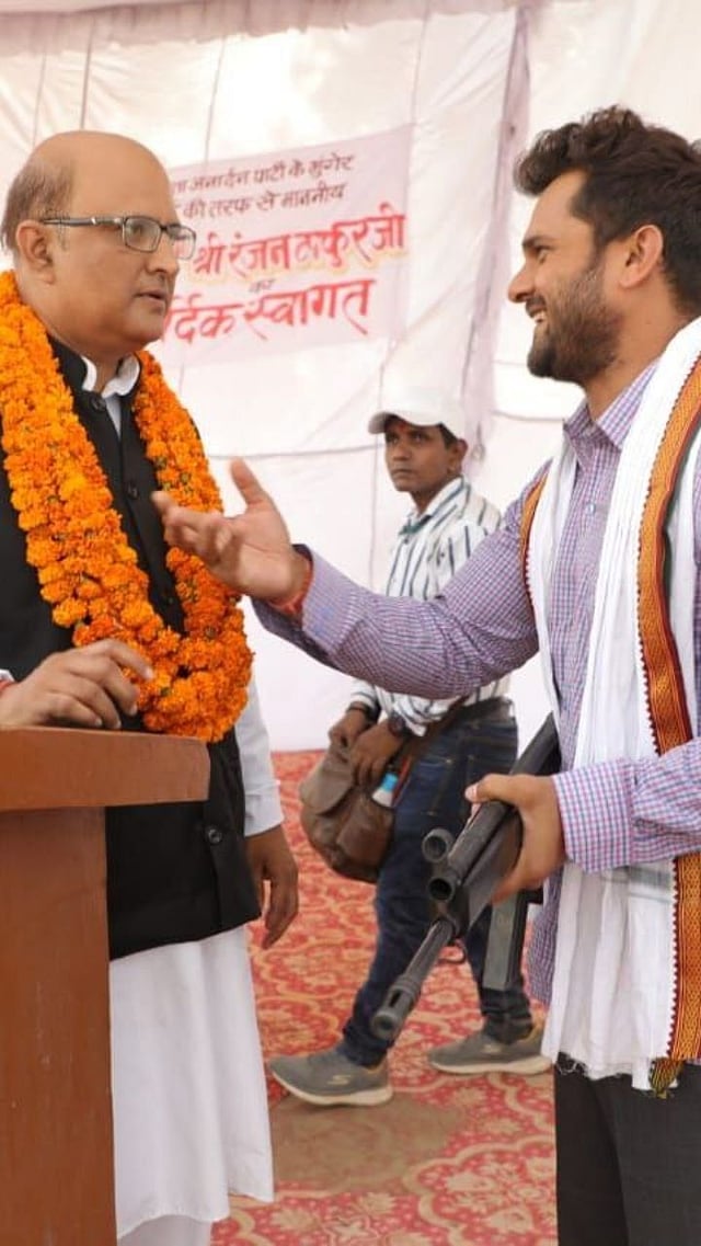 भोजपुरी सुपरस्टार खेसरीलाल यादव बंदूक घेऊन मुख्यमंत्र्यांच्या सभेत पोहोचला. याचा फोटो सध्या सोशल मीडियावर मोठ्या प्रमाणात व्हायरल होत आहे.