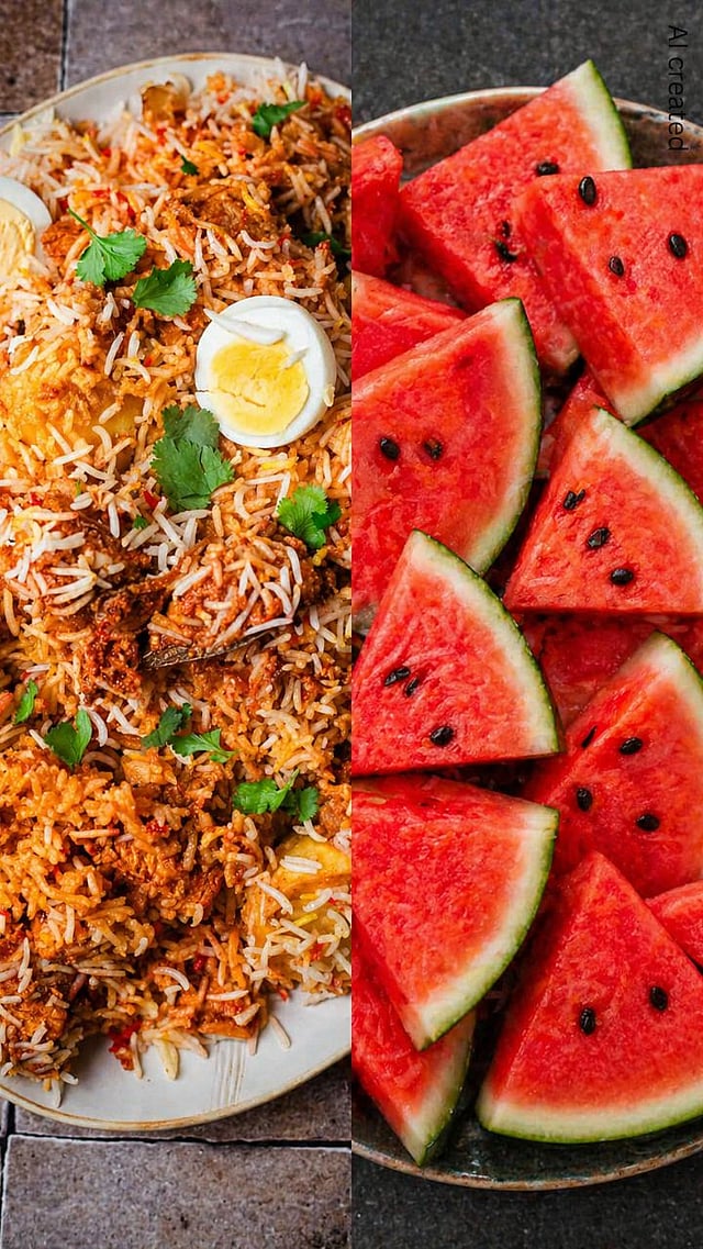 कलिंगड ३० मिनिटांत पचते, तर बिर्याणी पचायला ५ तास लागतात; यामुळे हे दोन्ही एकत्र खाल्ल्यास अपचन, गॅस किंवा पोटदुखी होऊ शकते.