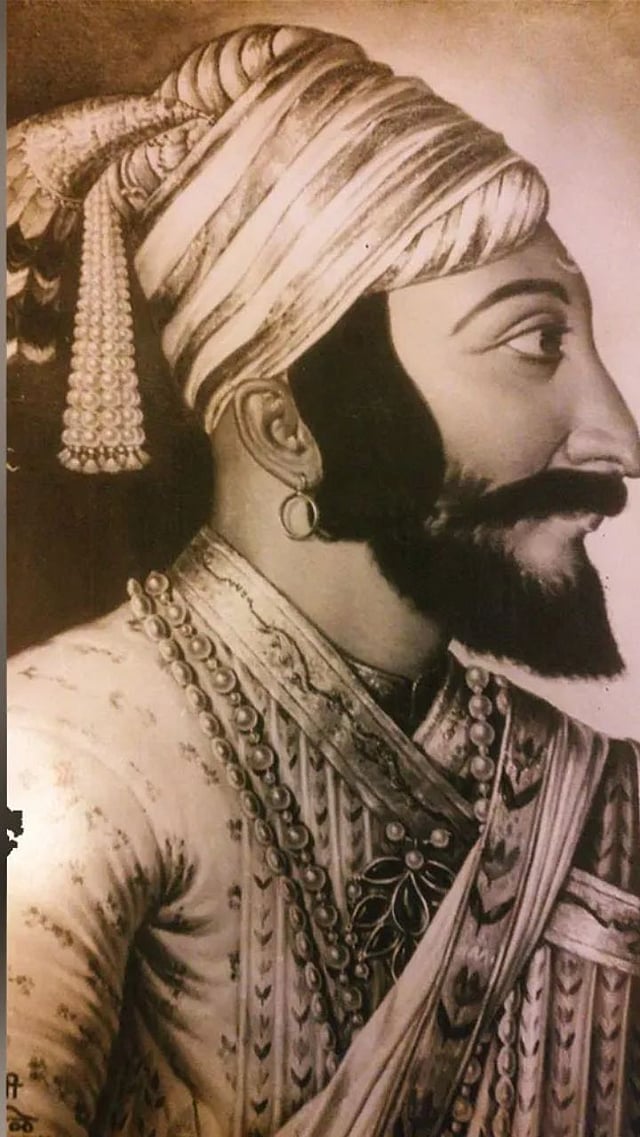 या चित्रात शिवरायांनी सोनेरी पगडी परिधान केली असून, हिरेजडीत शिरपेच आणि काळा तुरा मिरवले आहेत.