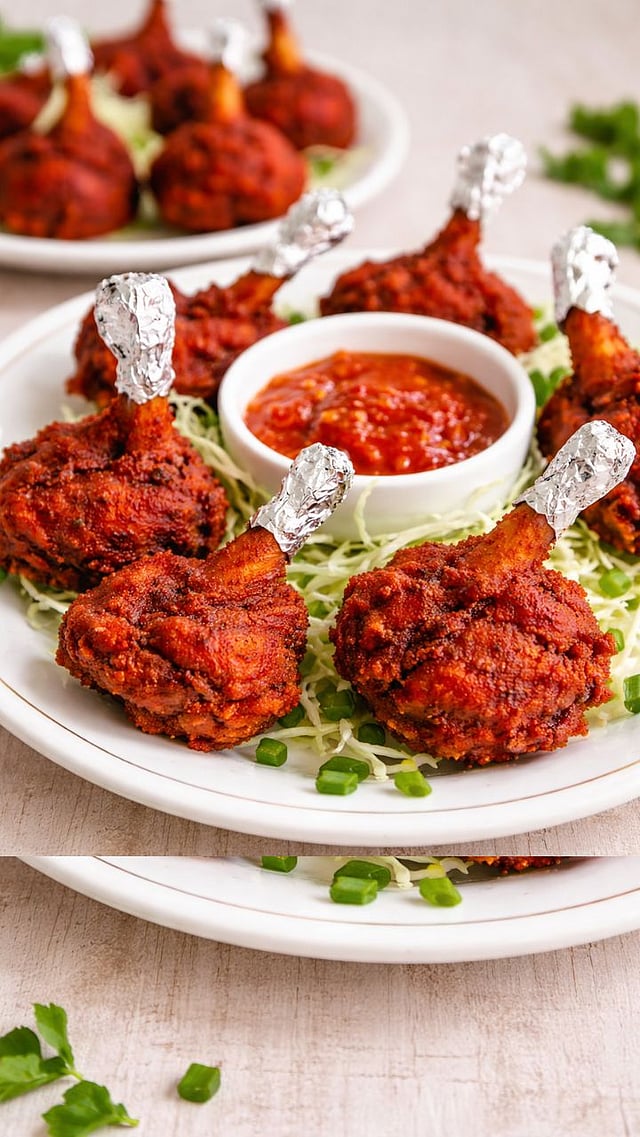 "गरमागरम चिकन लॉलीपॉप तयार आहेत! हे लॉलीपॉप तिखट-चमचमीत शेजवान सॉस आणि कांद्याच्या स्लाईसेससोबत खायला द्या."