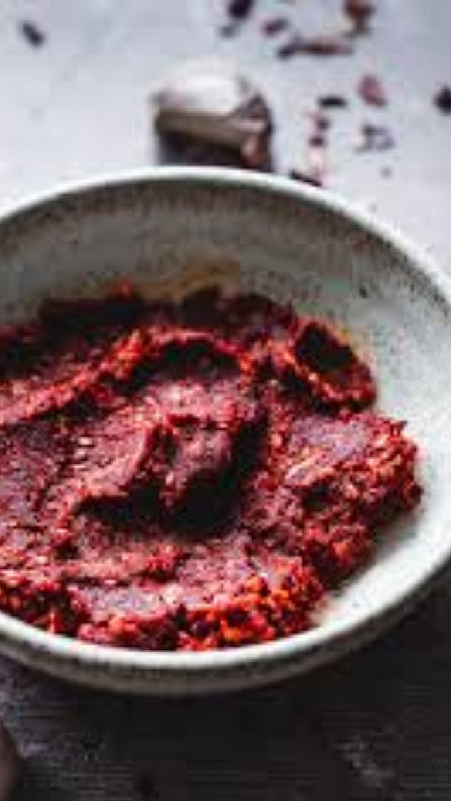 भिजवलेल्या मिरच्यांमधील पाणी काढून टाका. मिक्सरच्या भांड्यात मिरच्या, सोललेल्या लसूण पाकळ्या, जिरे आणि मीठ घालून गुळगुळीत पेस्ट बनवा.