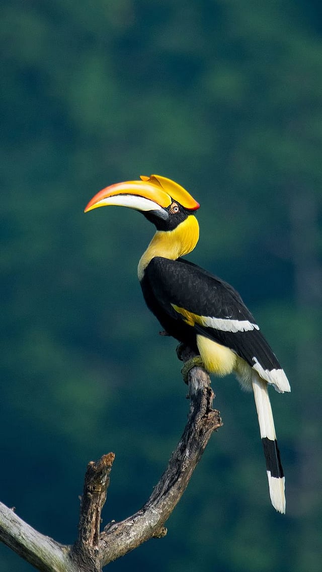 हा पक्षी म्हणजे धनेश. लांब, आकर्षक पिवळी चोच असलेला धनेश. संपूर्ण आयुष्य एकाच जोडीदारासोबत काढणारा पक्षी