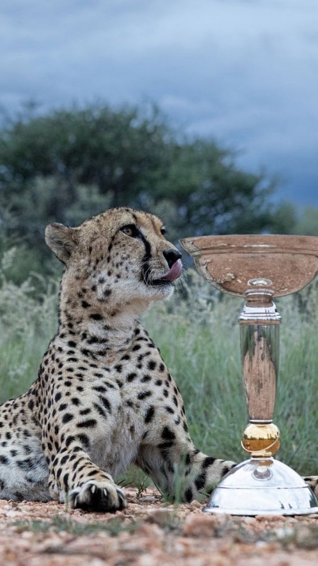 या फोटोमध्ये दिसते की जगातील वेगवान प्राणी असलेला चित्ता ट्रॉफी भोवती ऐटीत उभा आहे, तर दुसरा चित्ता आरामात खाली बसला आहे.