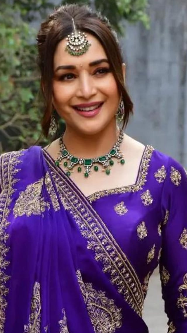 या फोटोंमध्ये माधुरी दीक्षित पुन्हा एकदा जांभळ्या रंगाच्या साडीत धुमाकूळ घालताना दिसत आहे.