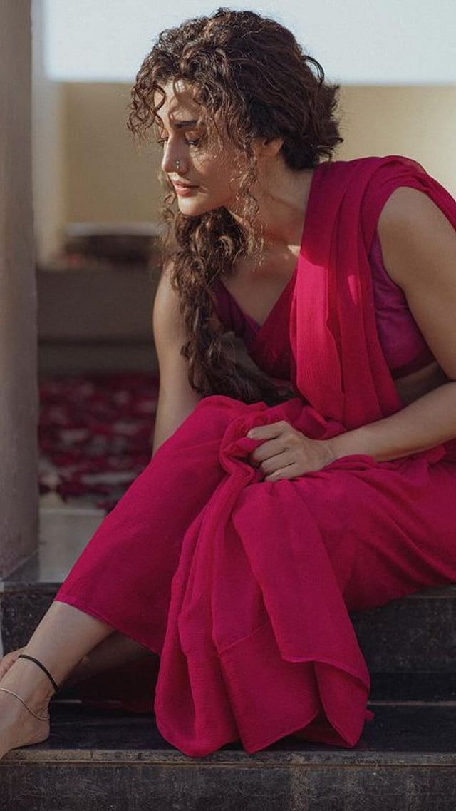 गुलाबी रंगाच्या साडीमध्ये तापसी हटके पोज देताना दिसत आहे.