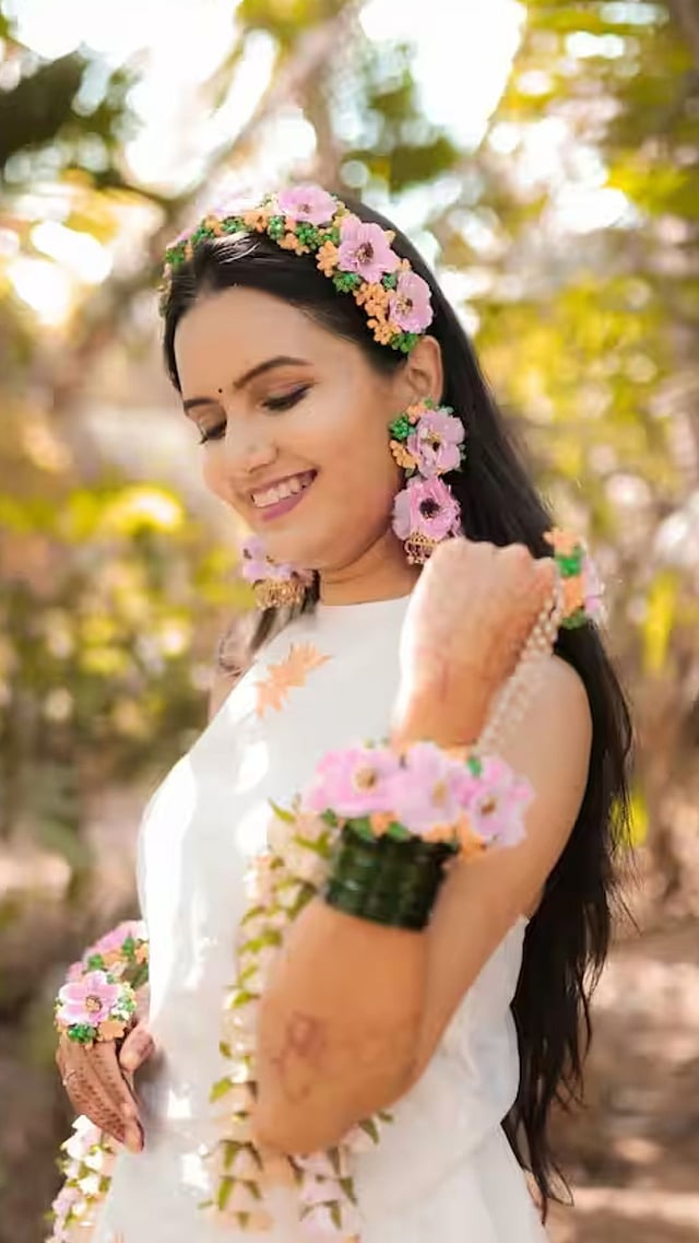 फुलांची सुंदर ज्वेलरी घालून क्षितीजाने तिचा हळदी लूक पूर्ण केला आहे