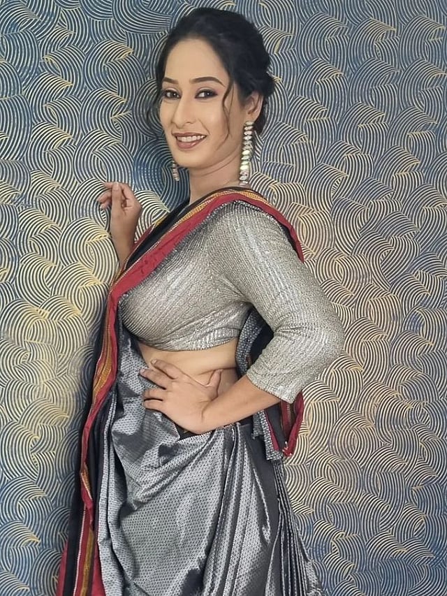 या थीमनुसार प्रियाने खास राखाडी रंगाची साडी नेसून त्याला मॅचिंग पर्स खांद्यावर अडकवली होती