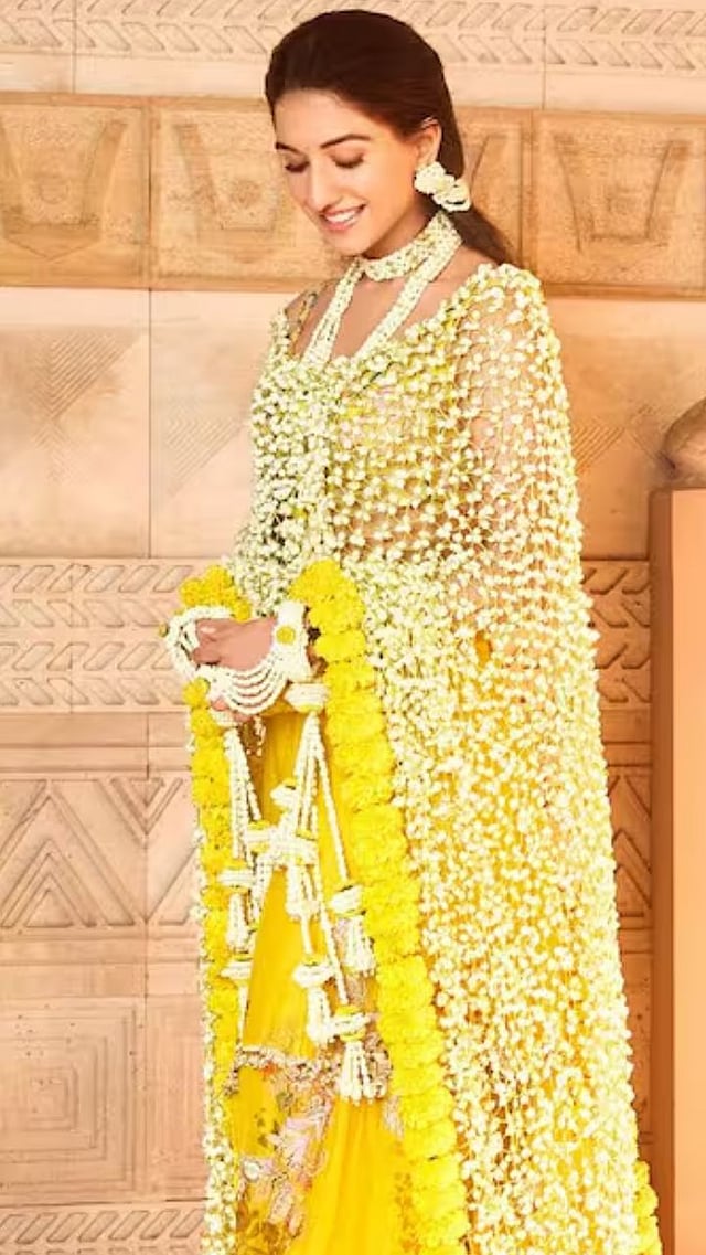 राधिका मर्चंटने हळदी समारंभासाठी पिवळ्या फुलांचा लेहेंगा परिधान केला होता.