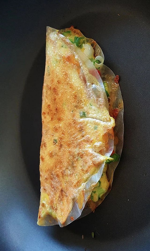 झाकण ठेवून २–३ मिनिटे मध्यम आचेवर शिजवा, जोपर्यंत अंडी सेट होतो आणि राइस पेपर हलका क्रिस्पी होतो.