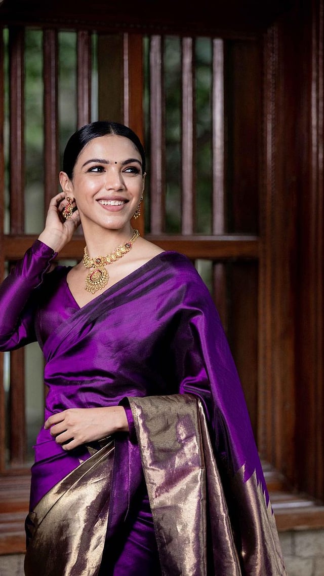 श्रियाने या लूकसाठी जांभळ्या रंगाची कांजीवरम साडी परिधान केली असून त्यावर गोल्डन ज्वेलरी घातली आहे