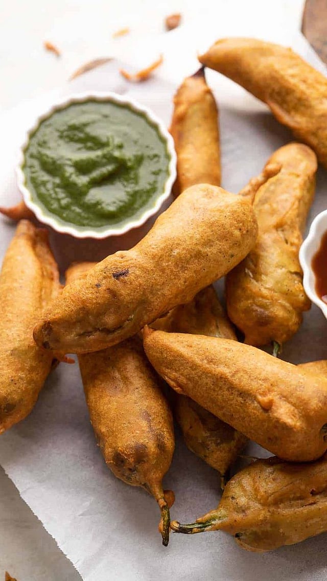 एका कढईत तेल गरम करा. तयार केलेल्या बेसन पिठात मिरच्या घालून त्याचे छोटे तुकडे कढईत टाका आणि मंद आचेवर भजी तळा.