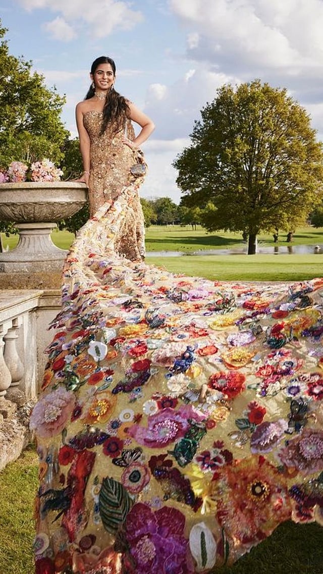 ईशा अंबानीचा हा ड्रेस तयार करण्यासाठी 10,000 तास लागले. हा ड्रेस फुलं, फुलपाखरे आणि ड्रॅगनफ्लायसह सजवला आहे.
