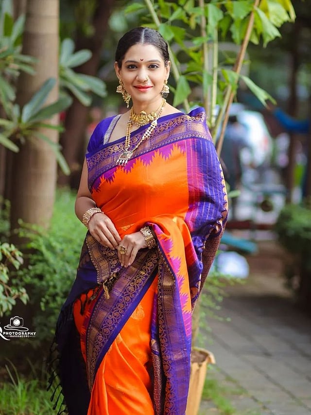निळी बॉर्डर असलेली केशरी रंगाची सुंदर साडी उर्मिलाने नेसली आहे