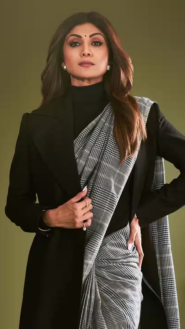 जर तुम्हाला ग्लॅमरस लूक हवा असेल, तर शिल्पा शेट्टीची स्टाईल ट्राय करा. तिने गुलाबी सिल्क सॅटिन साडी आणि मॅचिंग वेल्वेट कोट परिधान केला होता.