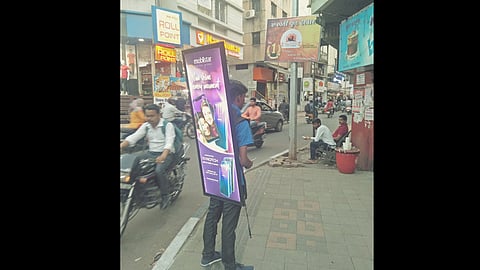 पुणे : अनेक वेळेला जाहिरातबाजीमुळे अनेकांना आपले प्राण गमवावे लागले आहेत. अनेक जणांची फ्लेक्स, बॅनर, बोर्ड या तर्हेने जाहिरातबाजी होण्यासाठी पसंती असते. पण आता पाठीवर एलईडी स्क्रीनचे ओझे घेऊन मोबाईलच्या जाहिरातीचे माहितीपत्रके वाटण्याचा नवा रोजगार सुर झाल्याचे चित्र पहायला मिळते.