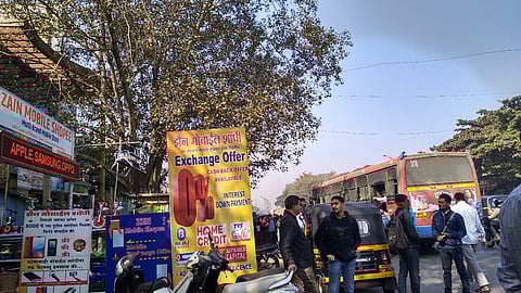 हडपसर : सोलापूर रस्त्यावर वैभव टॉकीजजवळ मोबाईल शॉपीचे मोठे होर्डींग लागले आहे, तिथे बसचे प्रवाशांची गर्दी, रस्त्यावरील रहदारी, रिक्षा, स्कूटर, बस, यामध्ये जेष्ठ नागरिक शाळेची मुले, महिलांना जीव मुठीत घेवून चालावे लागते आहे.